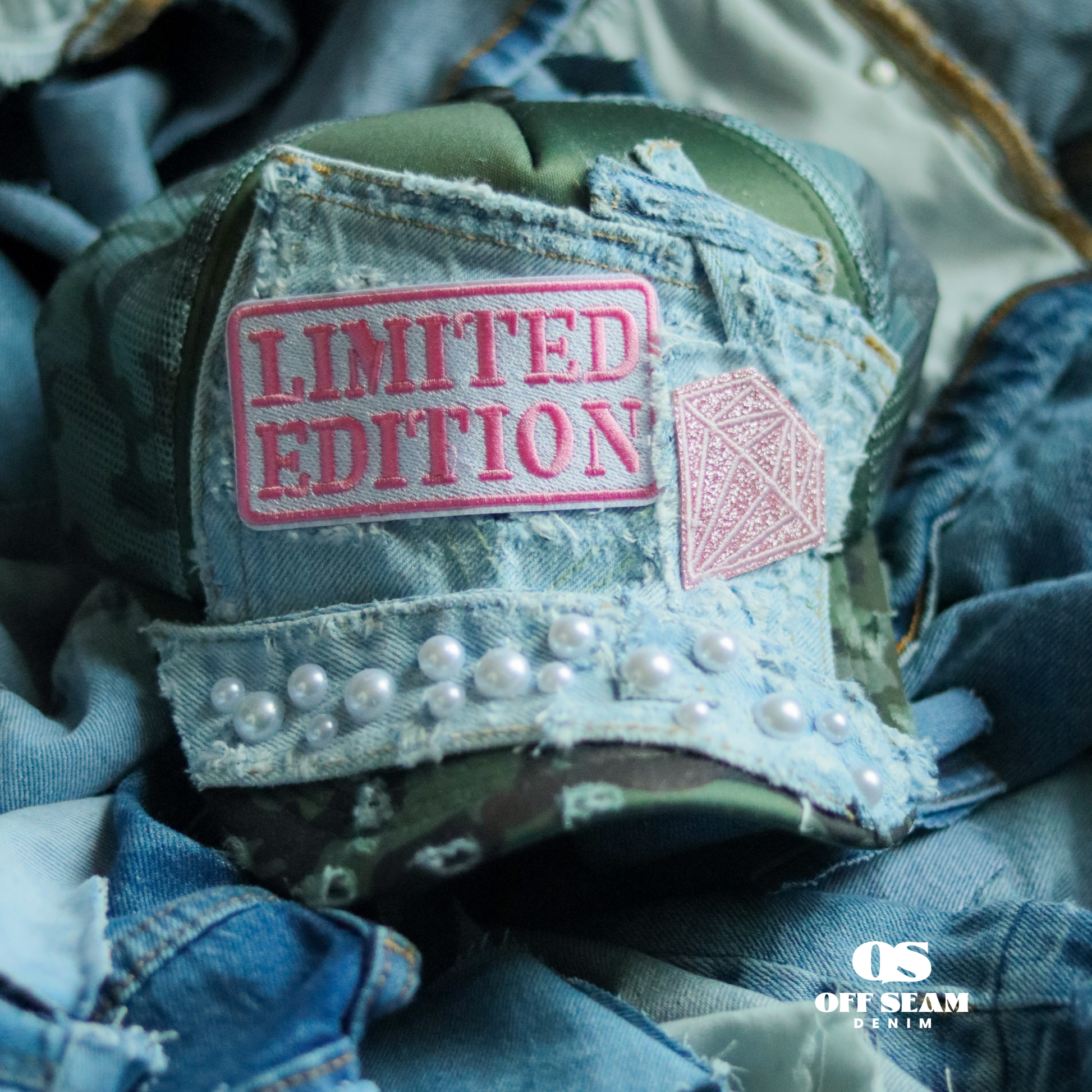 This design features a LIMITED EDITION patch in vibrant pink, a geometric diamond emblem, and a row of pearl accents for a striking mix of street style and luxe. The camo mesh back keeps it breathable, while the adjustable snap closure ensures the perfect fit.